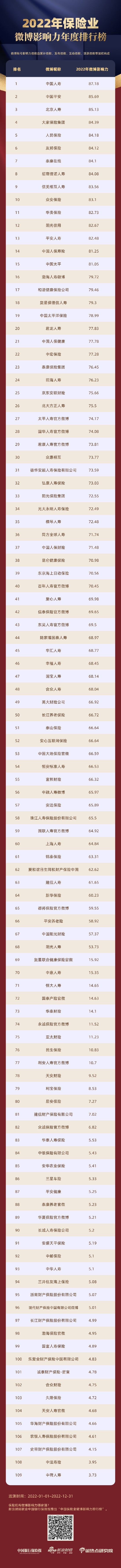 本次排行榜囊括109家保险机构微博账号,包括八家保险集团(中再保险、中华保险、华泰保险、富德生命集团、安联保险不在列)以及多家保险企业。另外,A股五大上市险企(中国人寿、中国平安、中国人保、中国太保、新华保险)均在列。