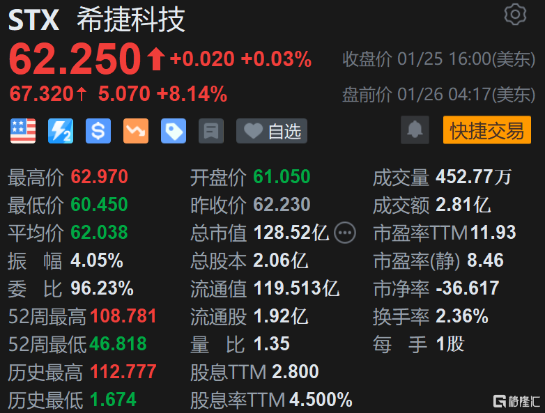格隆汇1月26日丨希捷(STX.US)盘前涨超8%,报67.32美元。希捷第二财季营收18.87亿美元,超预期的17.9亿美元;调整后每股盈余0.16美元,远超预期的0.06美元。公司预计第三财季营收20亿美元,超预期的18.7亿美元;调整后每股盈余0.25美元,低于预期的0.28美元。