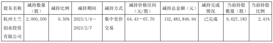 公告显示,减持前士兰创投合计持有公司股份11,627,683股,占公司普通股总股本2.91%,本次减持后持有股份9,627,183股,占公司普通股总股本比例为2.41%。