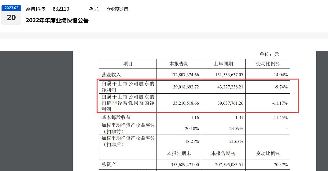 去年12月在北交所上市的雷特科技,于今年2月20日披露了2022年年度业绩快报,显示“变脸”。其中,营收1.73亿元同比增长14.04%,归母净利润为0.39亿元同比下滑9.74%,归母扣非净利润0.35亿元同比下滑11.17%。