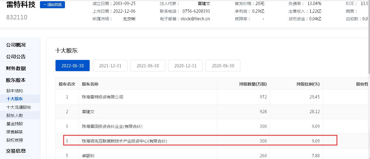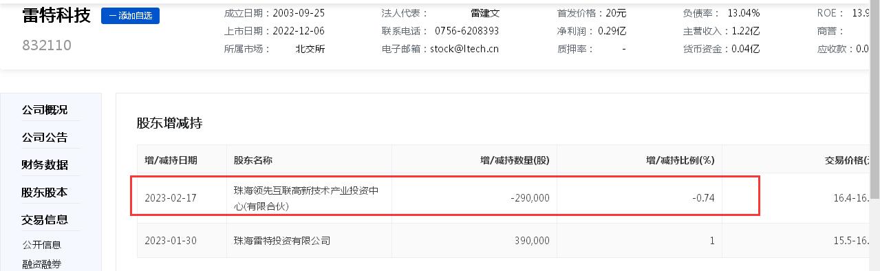 就在上述业绩快报披露前夕,即2月17日,雷特科技第三大股东珠海领先互联高新技术产业投资中心(有限合伙)减持了雷特科技股份29万股。