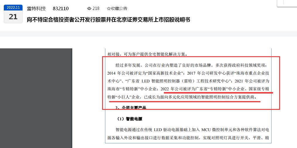 公开资料显示,雷特科技成立于2003年9月25日,于2015年3月9日在全国中小企业股份转让系统挂牌,并于2022年12月6日在北交所上市。与此同时,据上述招股书,雷特科技是一家专注于智能照明控制技术研发与产品创新的国家高新技术企业、广东省“专精特新”中小企业、国家级专精特新“小巨人”企业。主营业务为智能电源及 LED 控制器的研发、生产与销售。