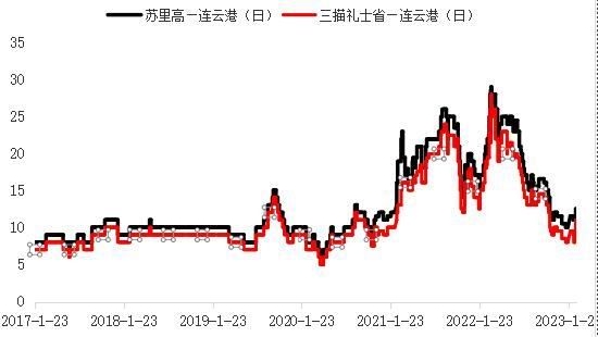 海运费近期有所上涨,主要是船东看好3、4月的行情。三猫礼士-连云港的海运费为11美元/湿吨,比1月末上涨了1.5美元/湿吨。苏里高-连云港的海运费上涨1美元/湿吨,报价12.5美元/湿吨。