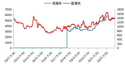 2023年1月全国镍生铁产量为3.6万镍吨,环比增长2.47%,同比增长13.75%。高镍铁产量为3.08万镍吨。低镍铁产量为0.53万镍吨。