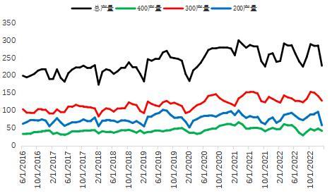 1月份不锈钢粗钢产量227.87万吨,其中200系产量57.84万吨;400系产量42.03万吨;300系产量128万吨,环比下降9.55%。