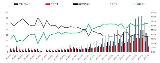 1月我国动力电池产量共计28.2GWh,同比下降5.0%,环比下降46.3%。其中三元电池产量9.8GWh,占总产量34.8%,同比下降9.3%,环比下降46.9%;磷酸铁锂电池产量18.3GWh,占总产量65.0%,同比下降2.5%,环比下降46.0。