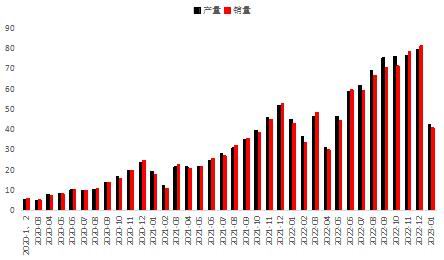 1月,新能源汽车产销分别达到42.5万辆和40.8万辆,环比分别下降46.6%和49.9%,同比分别下降6.9%和6.3%,市场占有率达到24.7%。