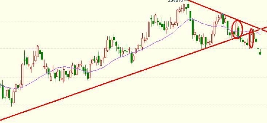 日K线上来看,三角形区间向下突破,价格呈现向下趋势。虽然偶有大阳反弹,但总体趋势不变。